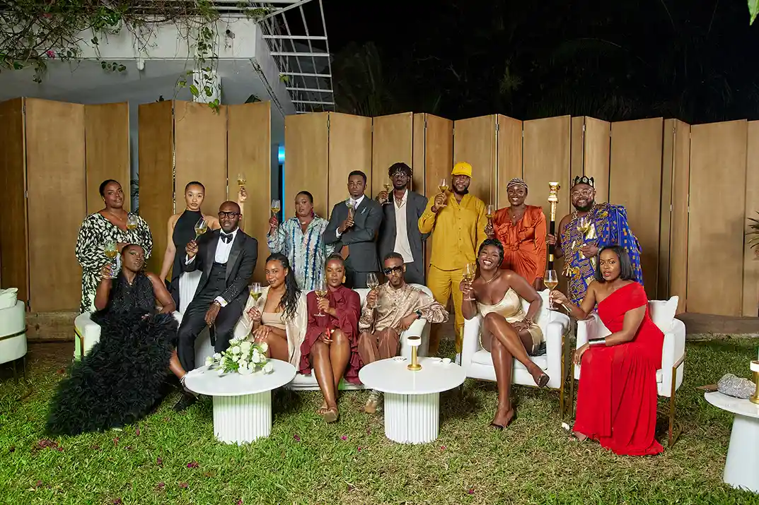 (bouteilles de champagne, dress code des invités, décor luxueux).