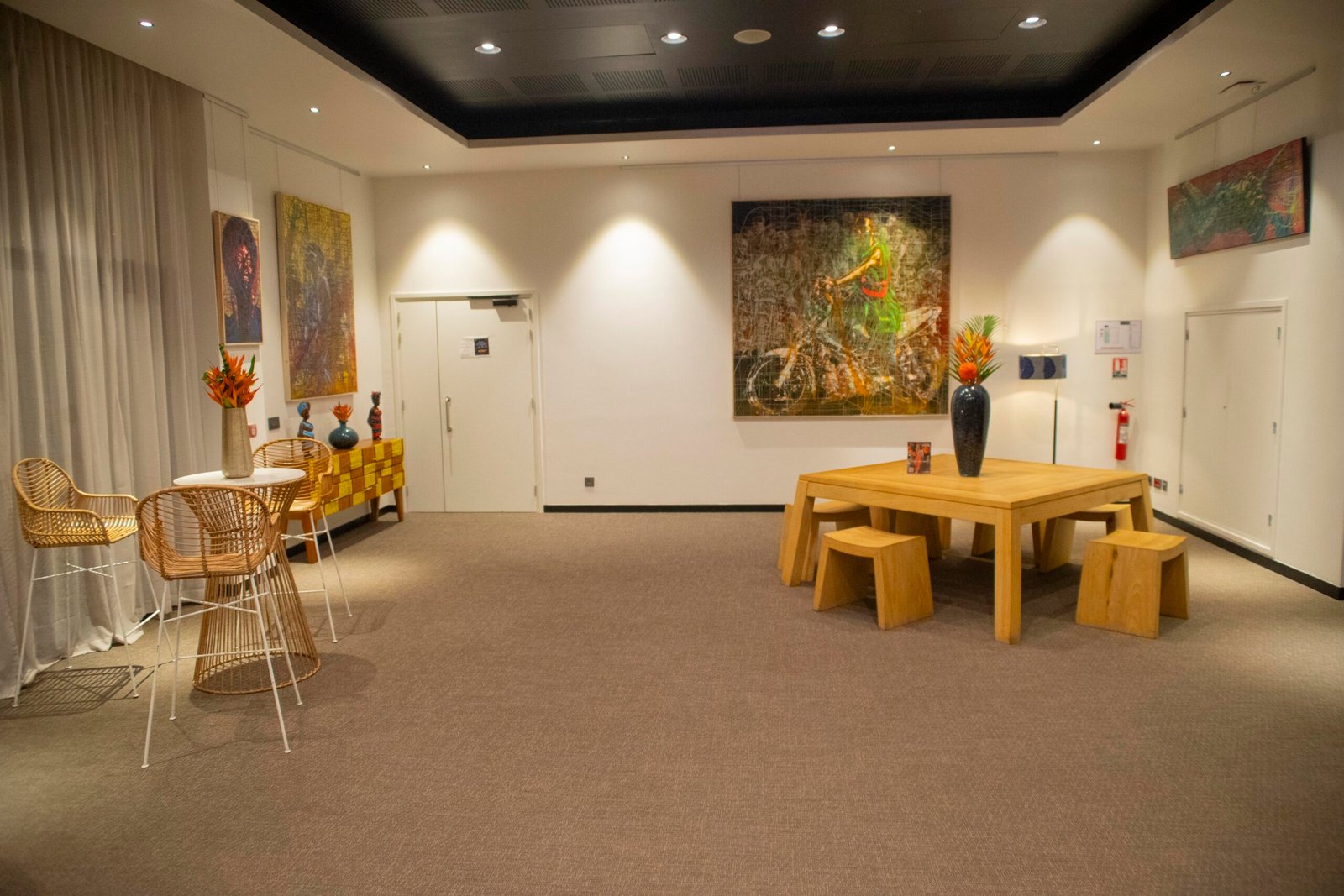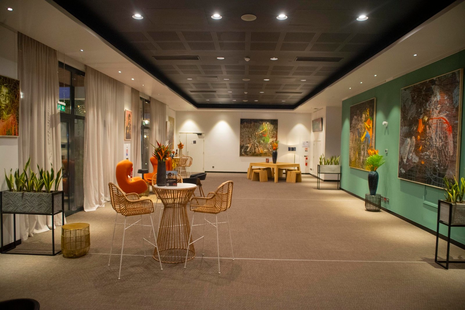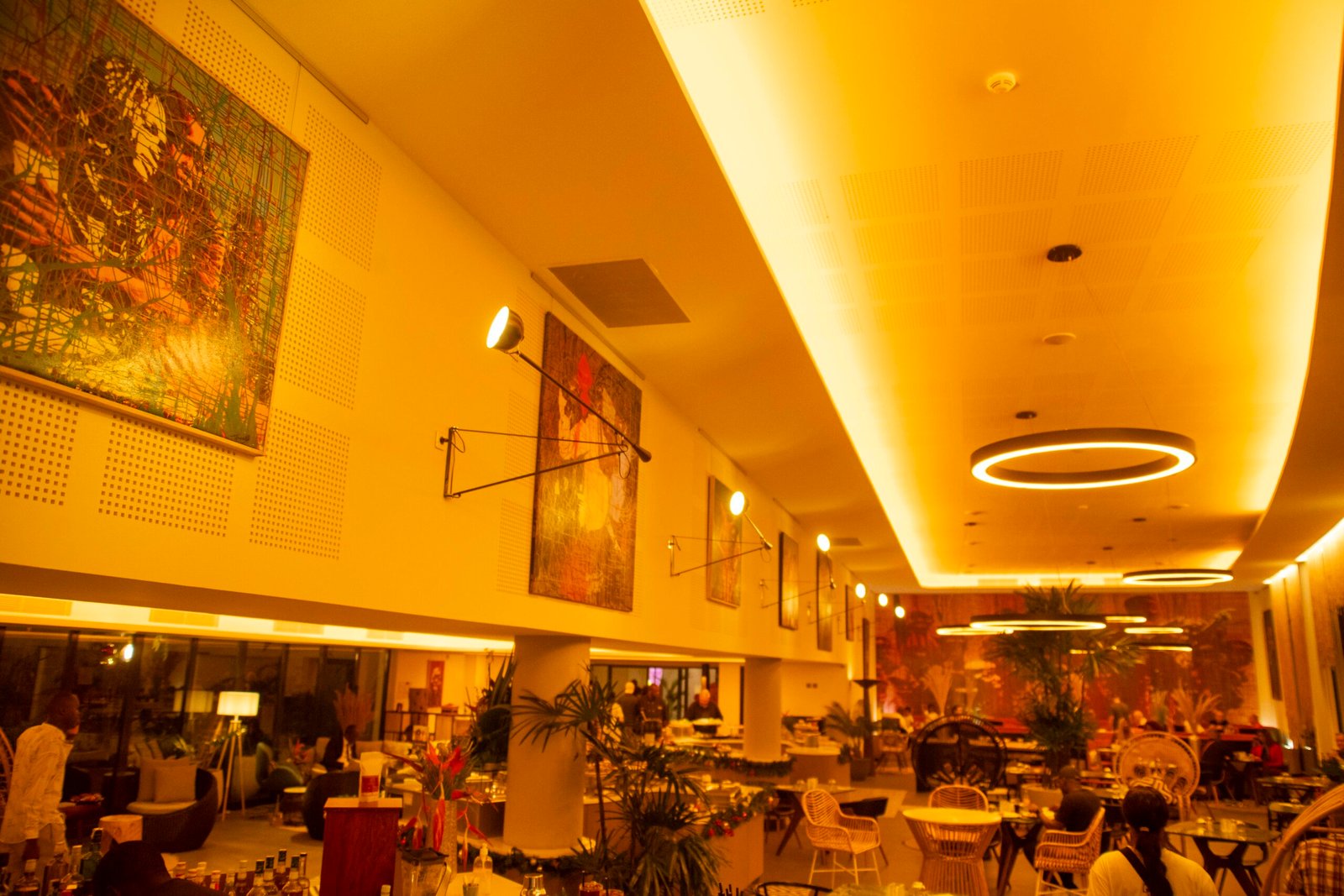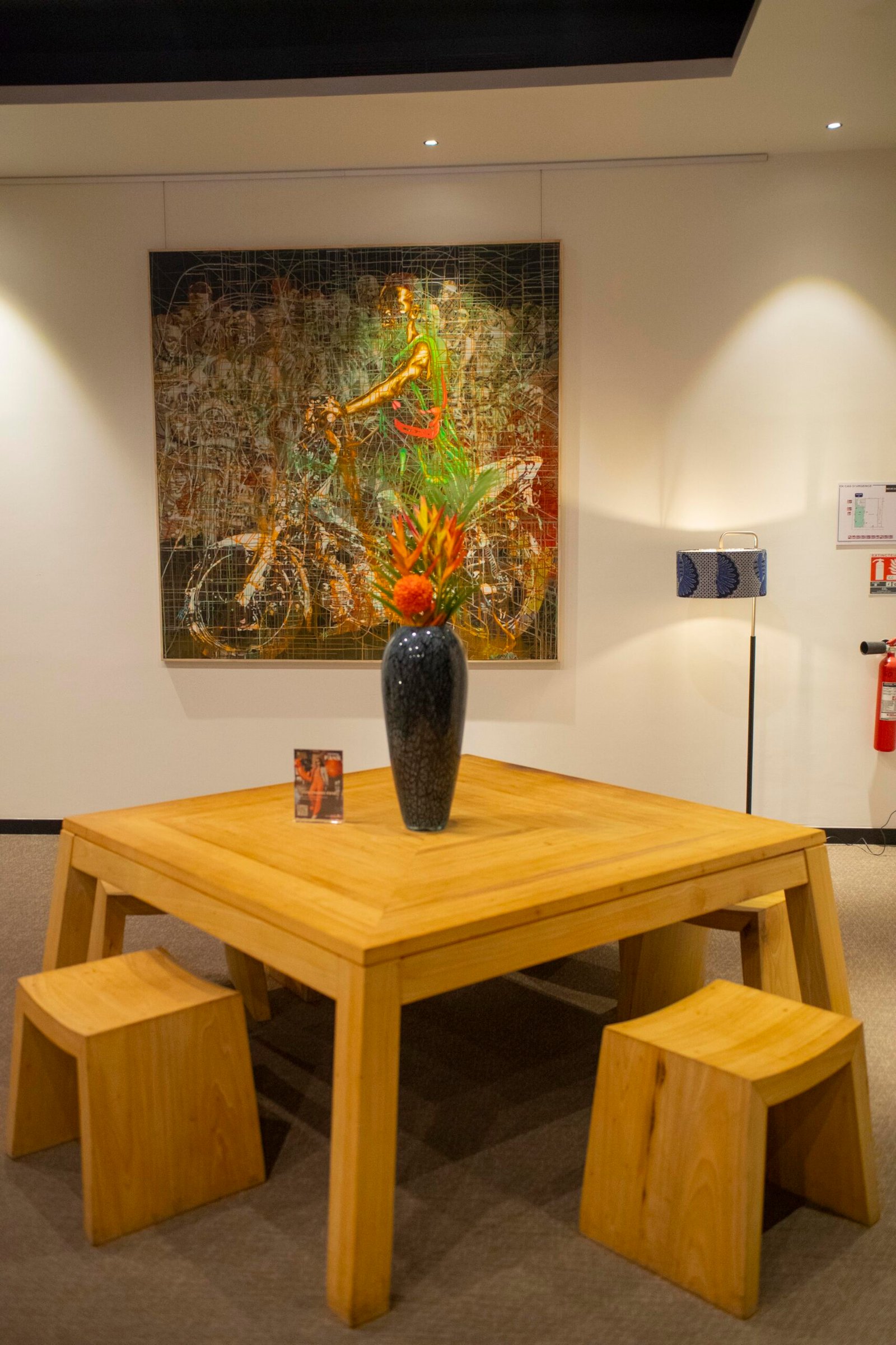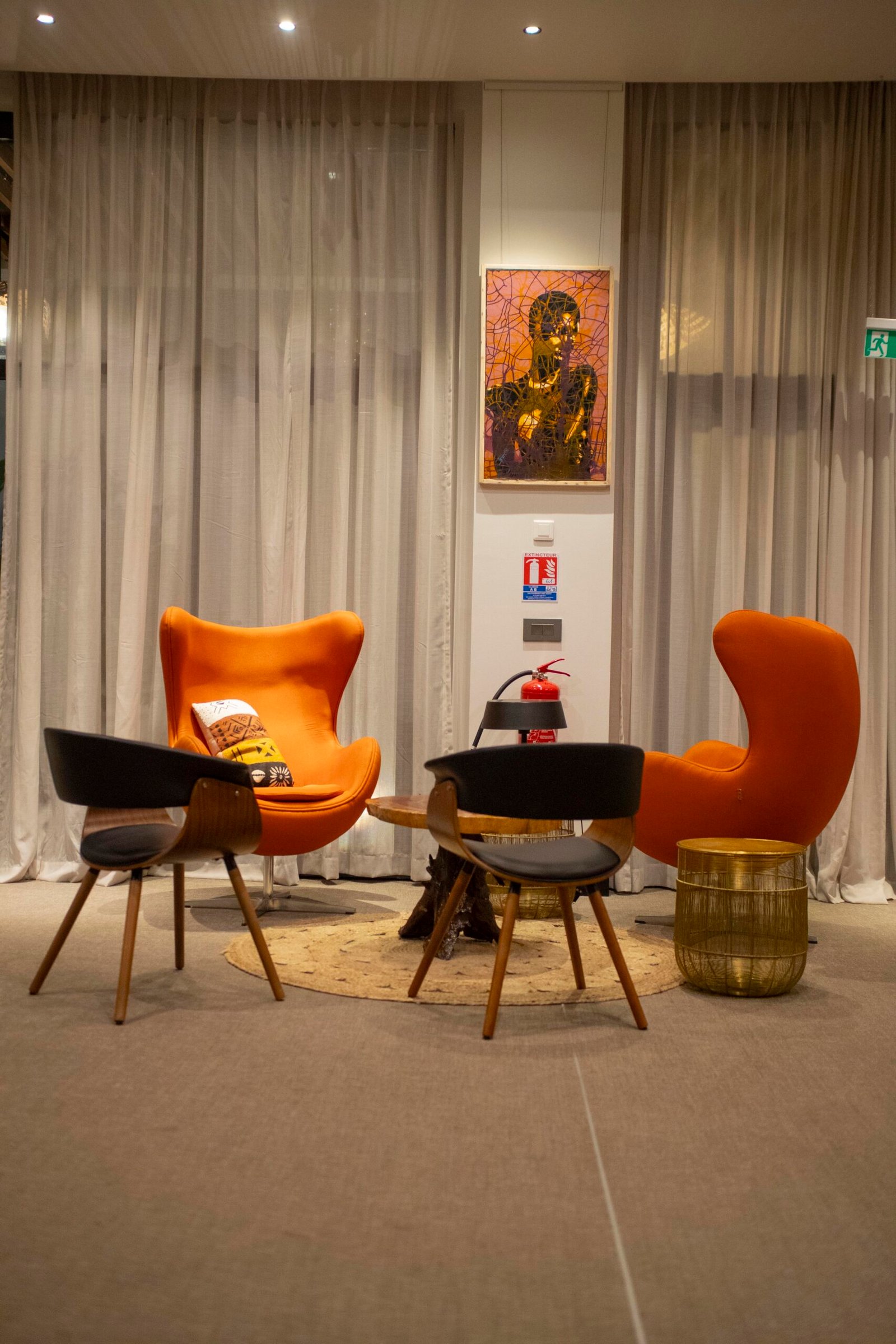 (mobilier, textures africaines, lumières tamisées).